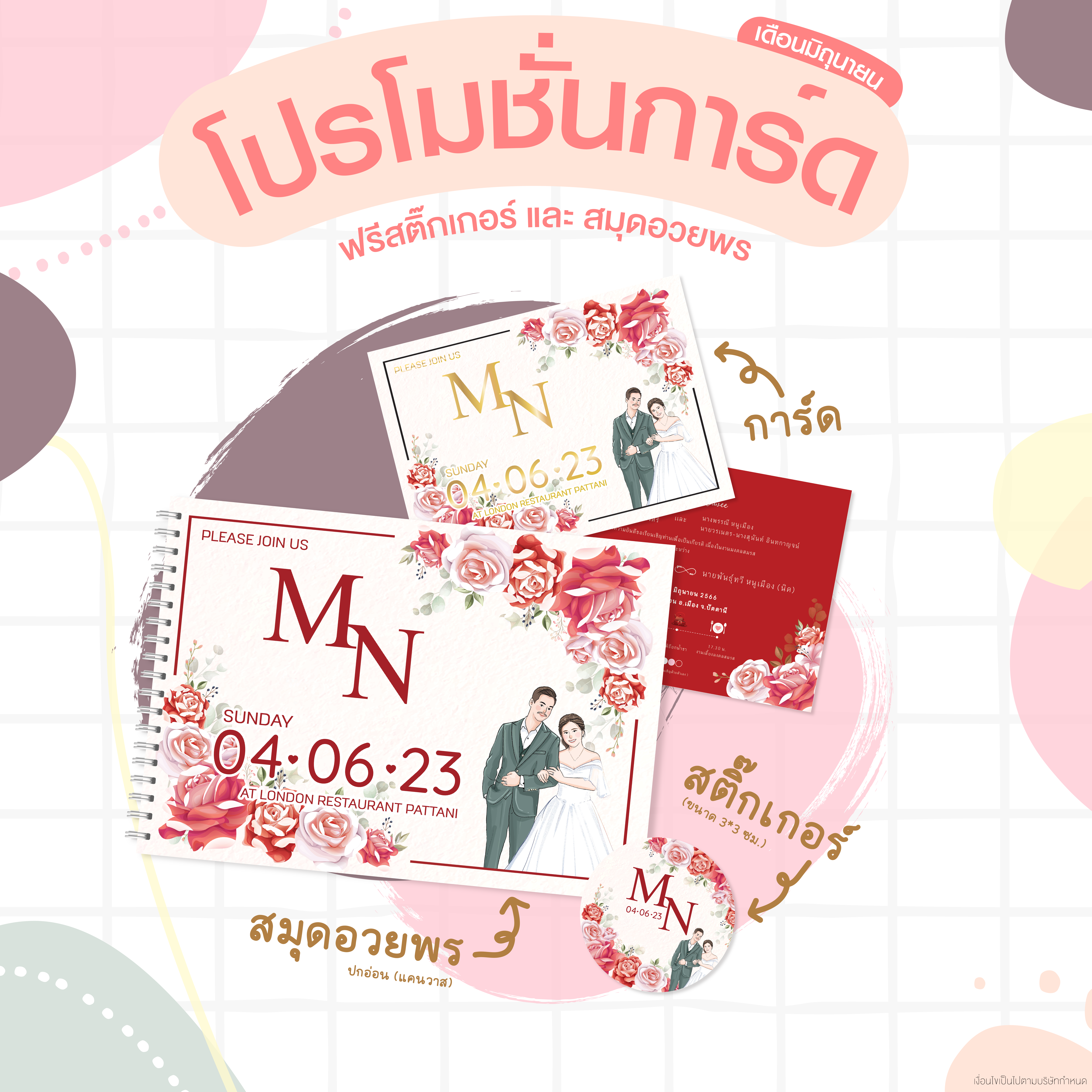 เมื่อสั่งการ์ด 100 ใบ ขึ้นไป รับทันที สติ๊กเกอร์ติดของชำร่วยเมื่อสั่งการ์ด 300 ใบ ขึ้นไป รัยทันที สมุดอวยพร แคนวาส